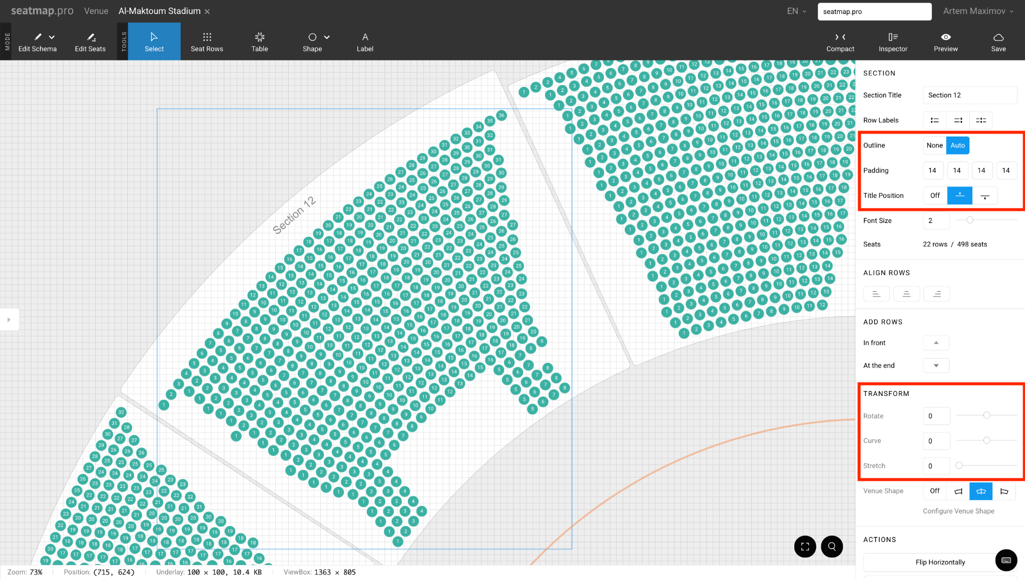 Once the overall venue shape is defined, go back to individual sections and enable Venue Shape linking (the little icon in the transform panel). Suddenly rows start gently following the outer curve. Use Stretch and Curve sliders per section to fine-tune how aggressively the rows bend. This is far cleaner than trying to manually curve every single row.