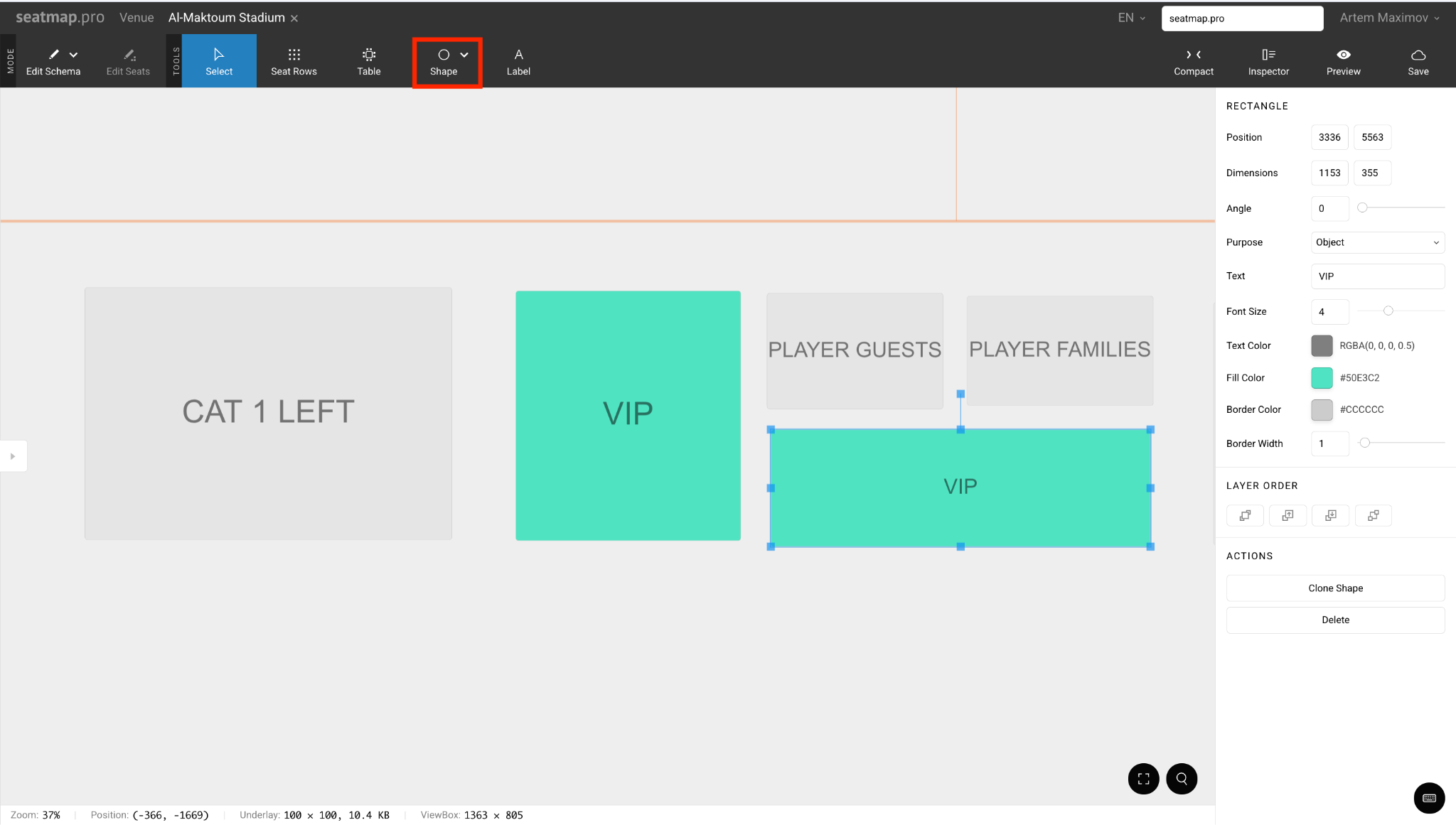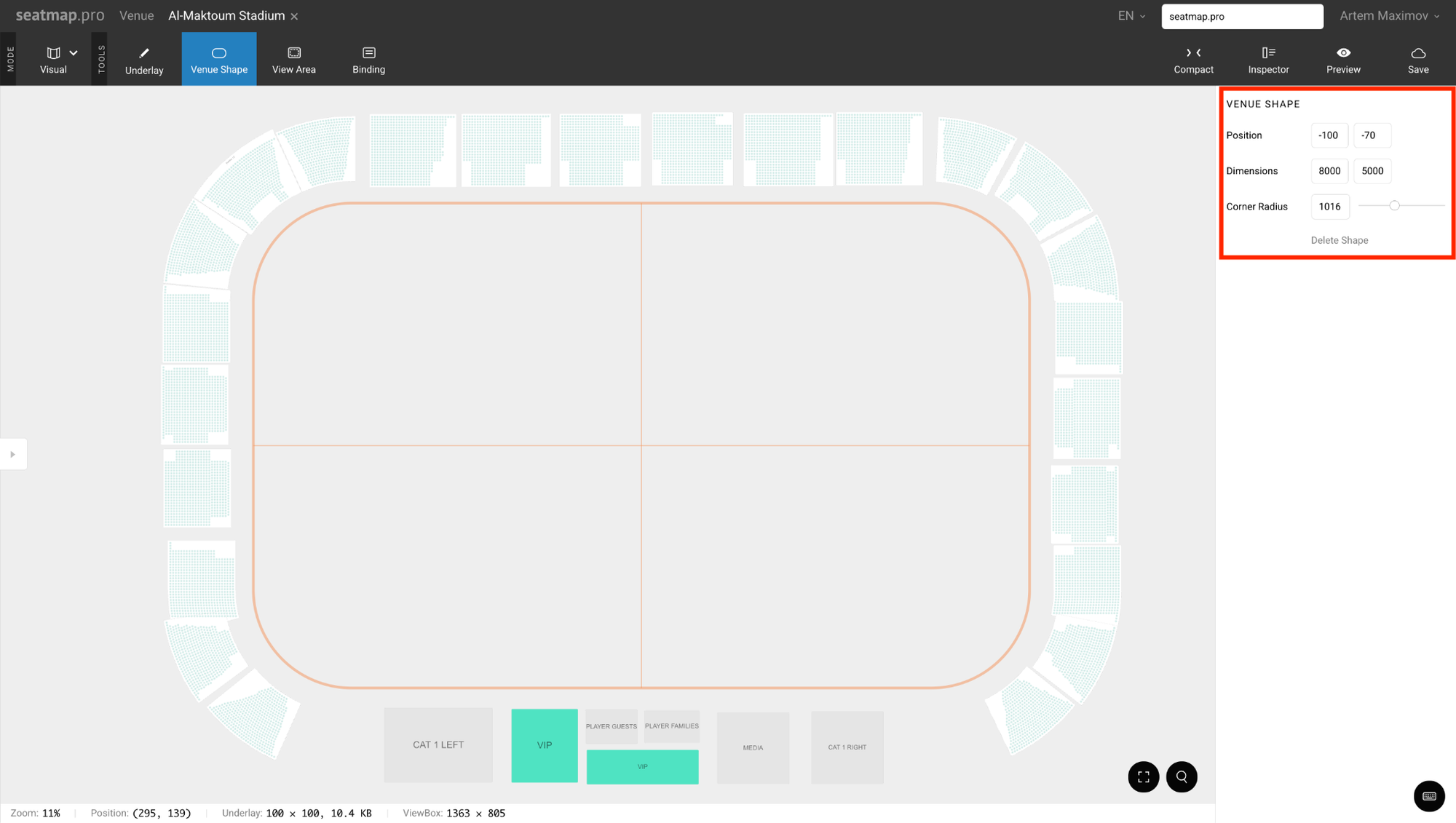 Next big tool: Venue Shape (oval icon in Visual toolbar). This is the single most powerful feature for stadiums and arenas.